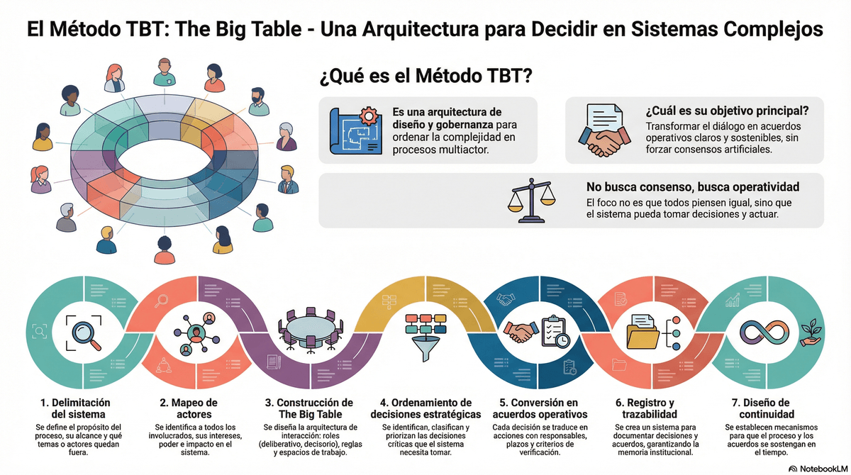El Método TBT – The Big Table es una arquitectura diseñada por eutopia.socail para abordar decisiones complejas que involucran múltiples actores, intereses diversos y necesidad de continuidad en el tiempo.